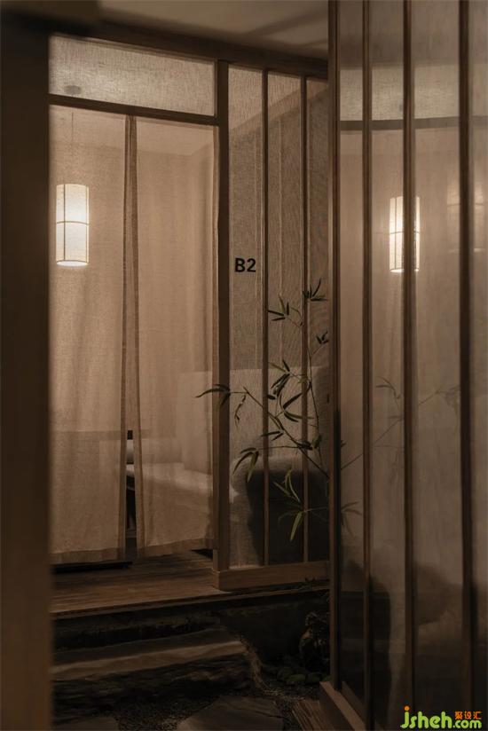 前臺(tái)及接待空間作為客人對(duì)于館內(nèi)空間形態(tài)的初次認(rèn)知,茶樓設(shè)計(jì)團(tuán)隊(duì)將“白墻”內(nèi)縱、橫梁木用新的設(shè)計(jì)手法詮釋。用木格柵、質(zhì)感涂料、木梁劃分出飲茶卡座、麻將包間、茶道空間三大區(qū)域。茶樓設(shè)計(jì)通道頂部用木格柵排陣,嵌入天光膜模仿自然光線的照入,使自然光線進(jìn)入到通道。進(jìn)入包間及卡座的通道區(qū)域,選用木質(zhì)、涂料、等具有自然質(zhì)感的材料。