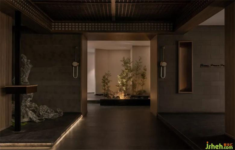 古建筑常見有時(shí)間肌理的“白墻”、老木門等原始元素用現(xiàn)代嶄新的材料呈現(xiàn),在與木格柵、青石板圍繞的同一空間中巧妙的形成一種差異化美感,茶樓設(shè)計(jì)極大的提升了接待的體驗(yàn)以及空間張力。