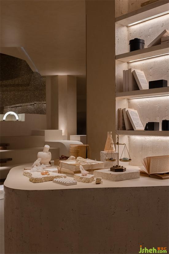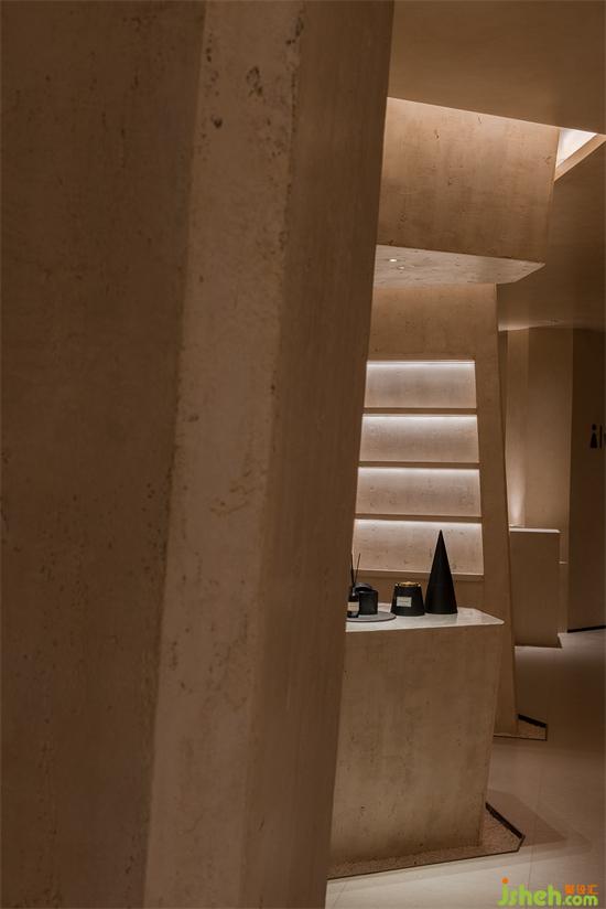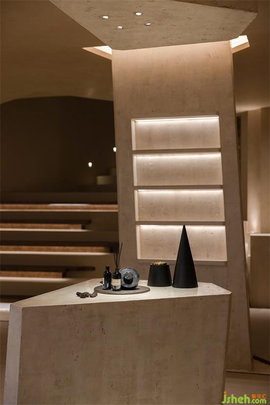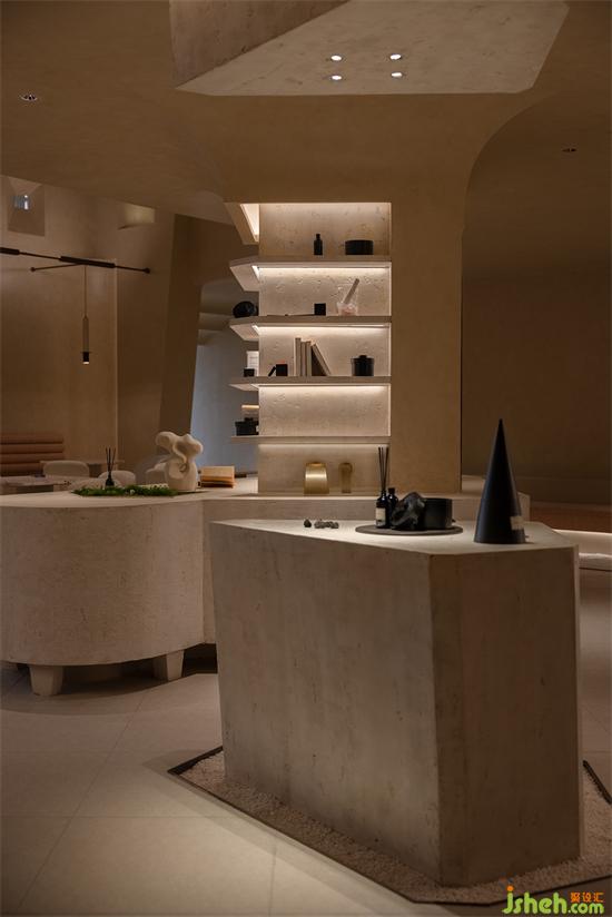 會(huì)所設(shè)計(jì)利用那些保留著古老悠長(zhǎng)之夢(mèng)的空間結(jié)構(gòu)引起人們的共鳴,從新古典主義借鑒過(guò)來(lái)的熟悉感,構(gòu)建并召喚集體回憶,在被抽象的歷史印象所充斥的環(huán)境中,當(dāng)代生活的轉(zhuǎn)瞬即逝被消解,會(huì)所設(shè)計(jì)與羅馬柱呼應(yīng)的是更有巖石形態(tài)與質(zhì)感的幾何體塊,直立的、傾斜的,穿插在空間中與弧面相接,內(nèi)嵌的"石龕"中陳放著手工敲打的鐵盒香薰與書(shū)卷,述說(shuō)著一段秘史。