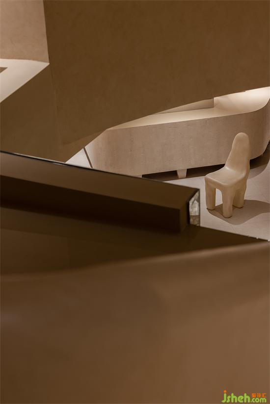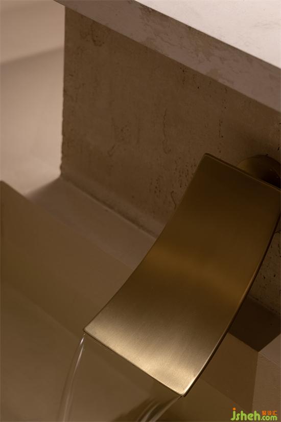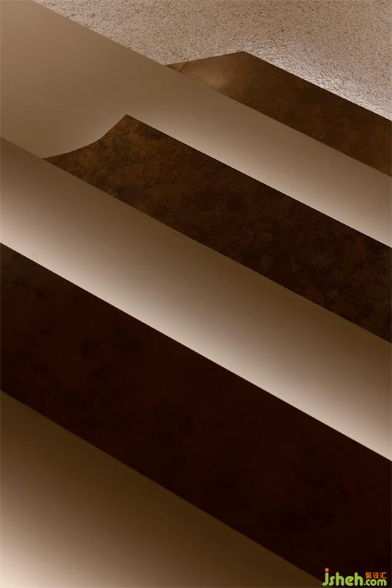 用“倫布朗光”的明暗對(duì)比方式勾勒空間形態(tài),在光影中重塑細(xì)膩、斑駁、顆粒狀與拋光材質(zhì)的沖突與交織般的戲劇效果。會(huì)所設(shè)計(jì)由微水泥與仿古銅不銹鋼拼接組成的臺(tái)階,燈帶隱藏在間隙,自下而上的燈光既在空間里描摹出多樣的層次,也能帶給拾級(jí)而下的人奇妙的秀場(chǎng)體驗(yàn)。