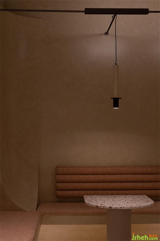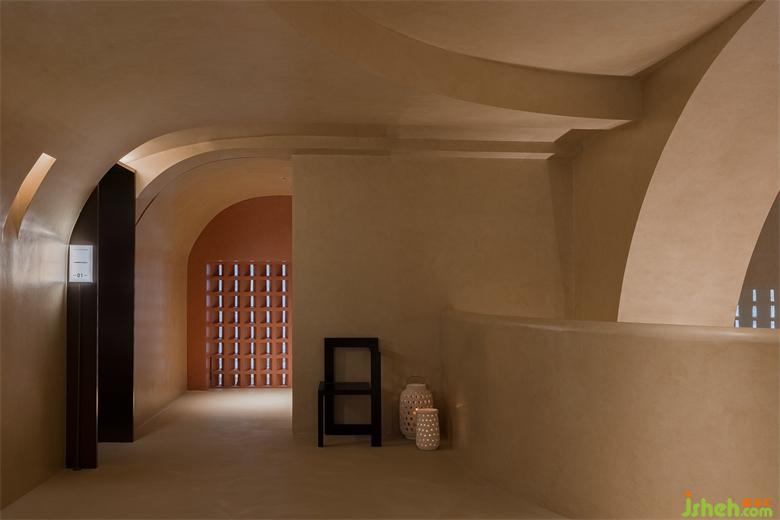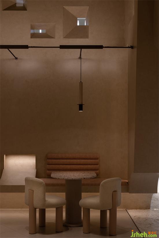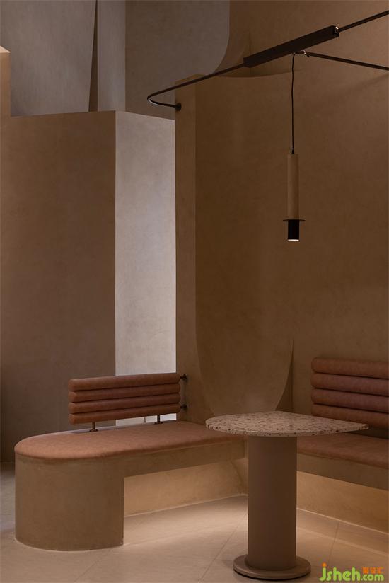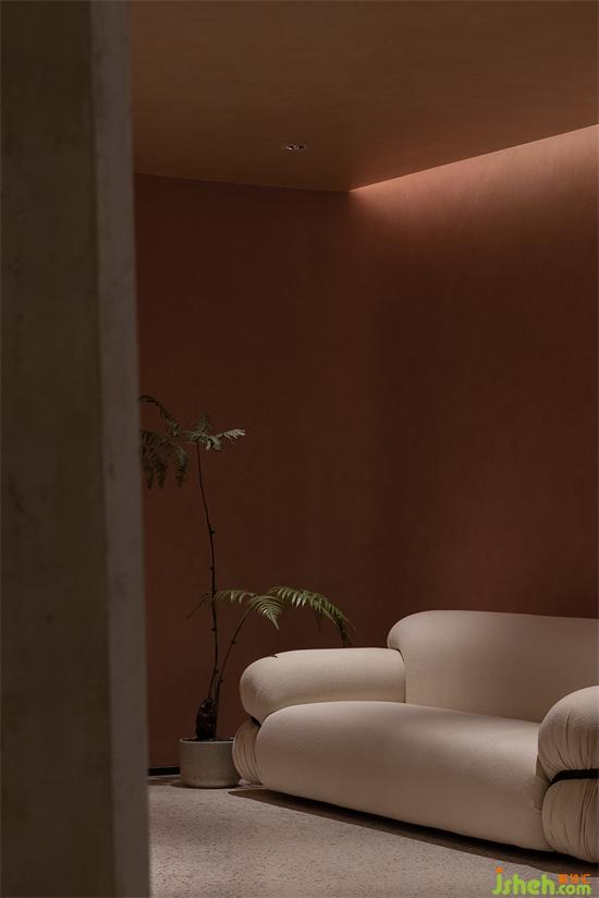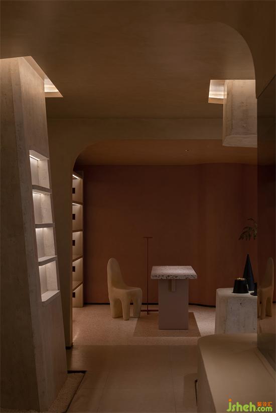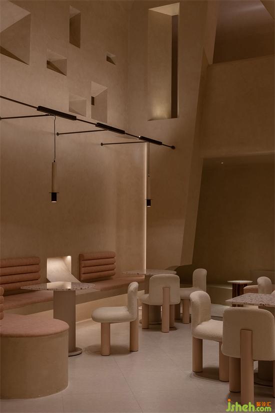 大面積沙色與淺紅砂巖色包裹整個(gè)內(nèi)建筑空間,向到訪的客人們最大限度展示“接納”的誠意。會(huì)所設(shè)計(jì)珊瑚色的坐墊,散落著粉水晶般的水磨石桌面,的好像暗藏在女性靈魂中,不會(huì)隨時(shí)間消逝的浪漫與溫柔。我們在墻壁上鑿出洞窟,將天光捕捉進(jìn)室內(nèi)。也以建筑材料疊加的方式,模擬出天光乍泄的自然感官。