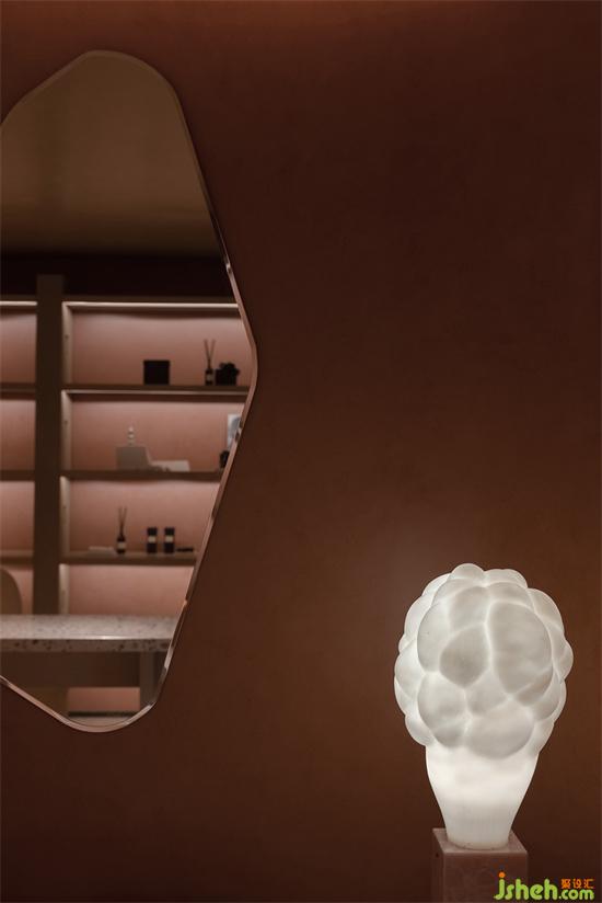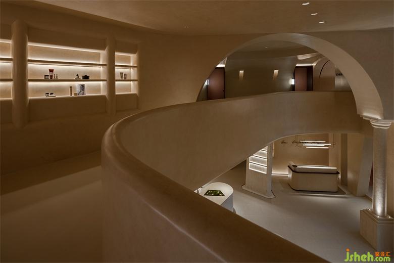 順著觸感細(xì)膩又柔軟的地毯,向上行走,去掠過外墻鏤空投進(jìn)來的日光;會(huì)所設(shè)計(jì)轉(zhuǎn)交之間,去揉化掉充滿他人想象的妝容,從生活道具的角色扮演中抽離,一個(gè)個(gè)如在洞穴中鑿出的獨(dú)立美容操作空間里,即將上演關(guān)乎“美”的短劇。