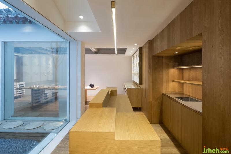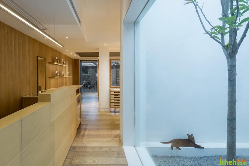 再往前走,收銀吧臺(tái)正對(duì)著這處空間中最宜人的庭院。一整面的玻璃墻不僅將自然光悉數(shù)灑進(jìn)室內(nèi),更是將庭院中的綠景引入了室內(nèi)。行至此處,來人皆會(huì)放慢腳步。