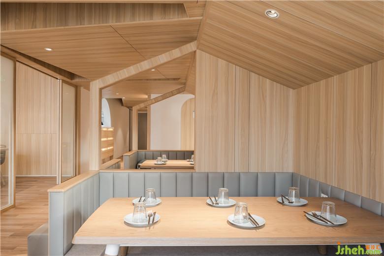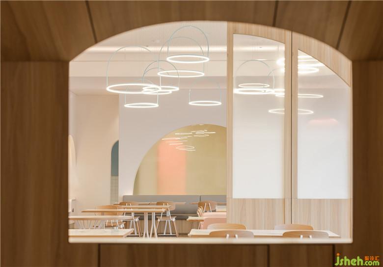 進(jìn)入餐區(qū),左手邊便是主要的就餐大堂,白色的空間基調(diào)配上天花漂浮的圓形光圈燈具,有一種天空中的夢幻。大廳的中段設(shè)計(jì)了折疊門,需要辦派對的時(shí)候還可以一分為二兩個(gè)空間。