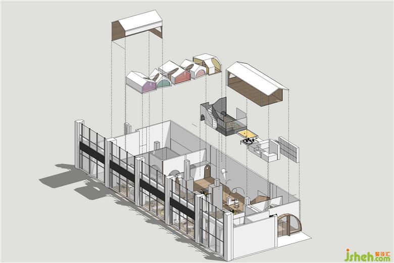 大廳的盡頭便是整個(gè)空間最最有趣的樹(shù)屋聚落。層錯(cuò)的小屋彩色的玻璃窗,玻璃的顏色不僅來(lái)區(qū)分空間又與視覺(jué)系統(tǒng)相呼應(yīng)。下層的小屋是包廂、兒童的休息室。而樓上層高不足1.5米的空間被設(shè)計(jì)成為又一不同主題的兒童體驗(yàn)空間,這個(gè)層高對(duì)于成年人而言需要彎腰才能進(jìn)入,但是對(duì)于孩子而言卻是恰恰合適而又充滿(mǎn)安全感。
