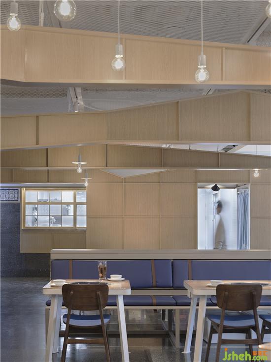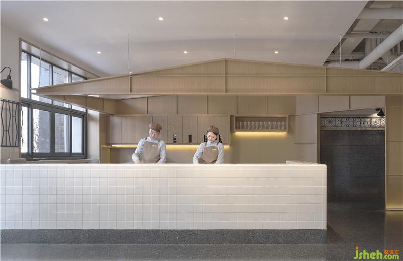 走進店內(nèi),目光所及充滿了舊火車站的氣息,一臺28老式自行車側(cè)立在門口。隔著各式紋樣的花玻璃,看到人影閃爍,以及半遮面的一個大大的時鐘。轉(zhuǎn)身向里走,是兩個郵筒。在臺灣郵筒是成對出現(xiàn)的,有一對郵筒還因為被大風吹彎,模樣意外可愛成為臺北最熱門景點之一。郵筒后就是暖暖茶歇了,干凈的小白磚臺面,轉(zhuǎn)角處的弧形小白磚,隱約透露著純樸與精致。黑糖珍珠的霧氣裊裊升騰,暖暖的香味彌漫整個茶歇,融合師傅們忙忙碌碌的身影,仿佛排隊進站一樣的熱鬧。餐廳設(shè)計