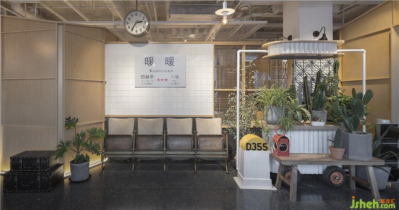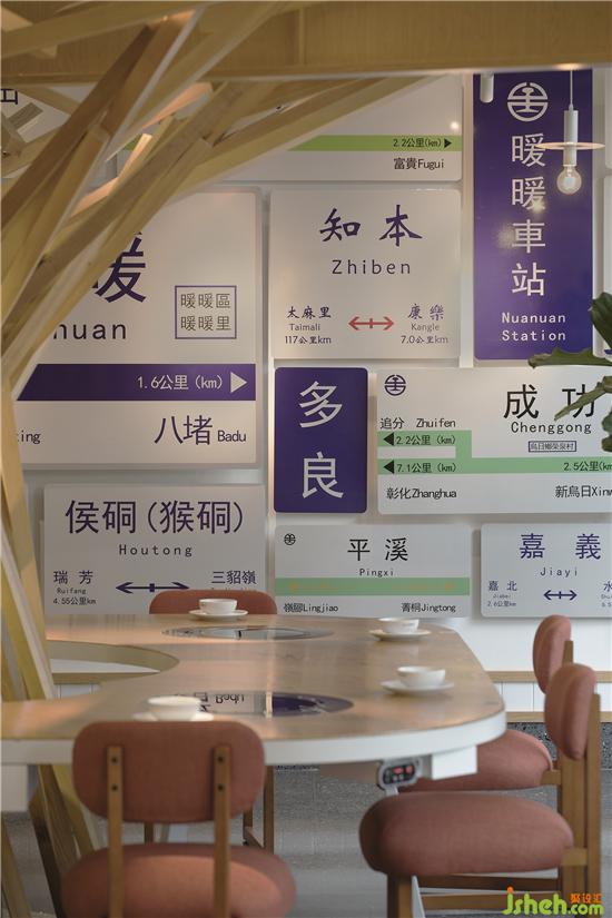 吧臺前面是由老式對象和郁郁蔥蔥的綠植組成的等候區(qū)。老式車站的座椅、懸掛的時鐘、鐵路旁的標識、信號燈、紅綠燈、小攤車上的雜貨等等,給那一坐,就像是走到了站臺上,馬上幾分鐘列車就要進站了。再往前方一看,一棵穿天大樹后面,有一整面錯落有致的站牌標,集合了臺灣知名的車站名還有不同式樣的車站標識。讓人不由得想起昔日的暖暖人流如織,茶葉、煤礦都在此轉(zhuǎn)運,不過隨著時間的推移而逐漸沒落,只有那些大樹陪伴在左右。樹下是一個大大共享餐桌,將就餐的客人帶回人流如織的暖暖車站,體會那時美好溫暖的氛圍。