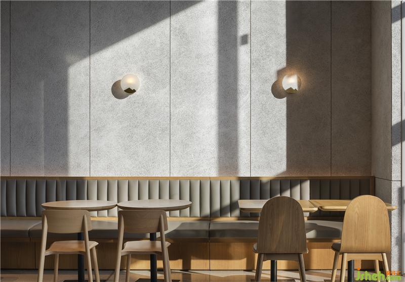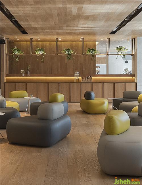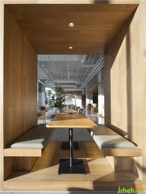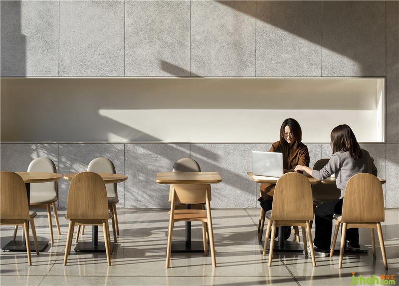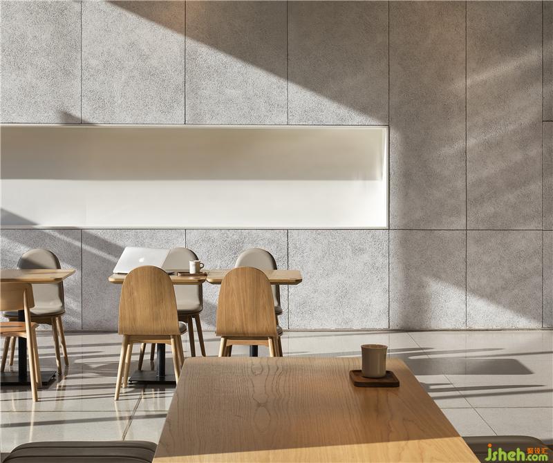 空間以白色與木色為主,自然簡潔,材質(zhì)上采用橡木地板與白色木色板為主要材質(zhì),墻面上大面積使用的白色木絲板材質(zhì)有效降低與其他區(qū)域的相互干擾,實現(xiàn)完美的聲學(xué)效果??Х葟d設(shè)計