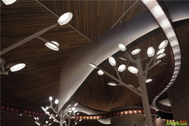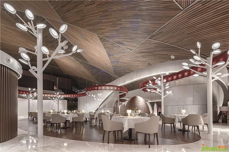 餐廳的照明則采用了樹的形態(tài),樹象征著生命力,樹燈無序地穿插在餐廳各處,解決了無吊頂?shù)恼彰鲉栴}的同時(shí),也給空間注入了新生的寓意。配合飄帶立面造型,營(yíng)造了藝術(shù)叢林的空間氛圍。