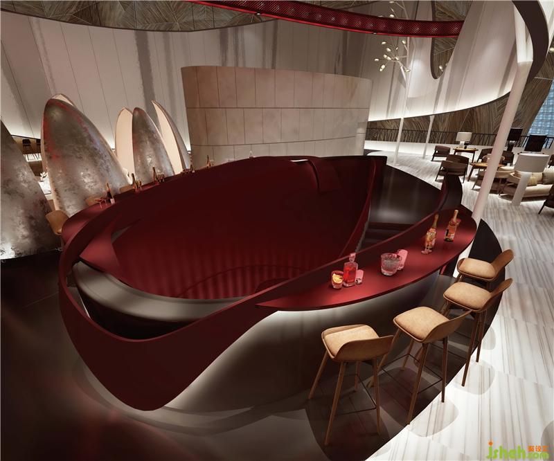 中部的旋轉(zhuǎn)樓梯分隔了餐廳南北兩區(qū),如果僅僅將它作為一個(gè)通道口未免太浪費(fèi),于是設(shè)計(jì)團(tuán)隊(duì)在保留了旋轉(zhuǎn)樓梯原有的扶手石材的基礎(chǔ)上,依附著樓梯扶手石材形態(tài)利用紅色人造石做成了一個(gè)具功能性的酒吧臺(tái),酒吧飄帶的形式亦呼應(yīng)了空間整體概念。