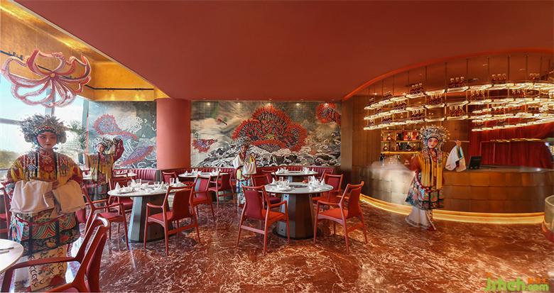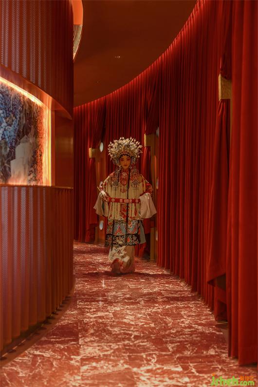 同時(shí),幕布飄垂而下的裙褶不單單體現(xiàn)“猶抱琵琶半遮面”的戲劇神秘感,更是直觀的模仿“水浪”,與粵界海鮮火鍋的主題產(chǎn)生呼應(yīng),即是“外有乘風(fēng)破涼一景,內(nèi)修乘浪而來(lái)”之寓意。