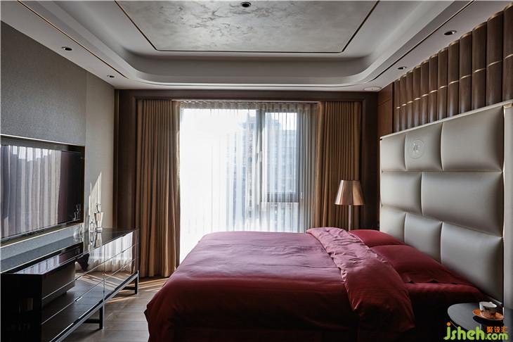 在一樓主臥的設(shè)計上,根據(jù)居住主人的年齡、性格和喜好,設(shè)計師將空間打造得沉穩(wěn)寧靜又不失獨(dú)特優(yōu)雅。設(shè)計師利用材料的多元化應(yīng)用、幾何造型的有機(jī)設(shè)計融合、線條節(jié)奏和韻律的充分展現(xiàn),燈光造型的立體化應(yīng)用等表現(xiàn)手法,呈現(xiàn)了一個端莊典雅的臥室空間。床頭背景墻是設(shè)計中的重頭戲,木質(zhì)細(xì)膩,造型錯落有致,端莊大氣,床上用品的一抹玫瑰茜紅,讓優(yōu)雅的臥室空間多了一份溫馨柔和,獨(dú)具浪漫主義情懷。