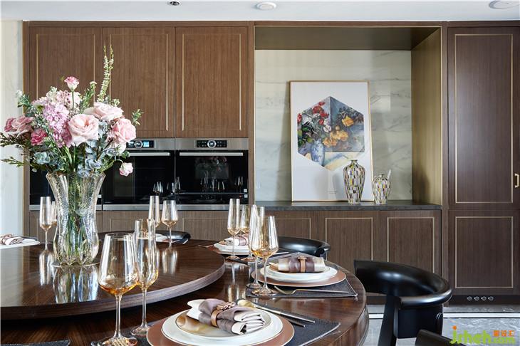 抬頭金屬吊燈的設(shè)計,增強(qiáng)了空間的層次,讓整個空間立體起來。造型簡潔優(yōu)雅、木質(zhì)珍貴的promemoria的餐桌,搭配金屬質(zhì)感、弧形設(shè)計的餐椅,讓空間增添符合現(xiàn)代人審美的時尚質(zhì)感,并與周圍硬裝的空間塑造相呼應(yīng),軟硬裝和諧融合,成功的營造出莊重高貴的空間氣質(zhì)。質(zhì)地精致的高腳杯等餐具和鮮花元素的植入,使用餐環(huán)境變得美麗優(yōu)雅,讓用餐氛圍多了一份浪漫怡人。