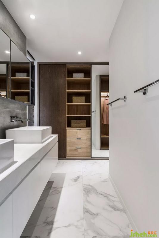材料運(yùn)用上使用了天然木皮,原木散發(fā)的質(zhì)樸結(jié)合石材的自然紋理、傳達(dá)出室內(nèi)外的平衡共生,設(shè)計者希望在純凈空間里,讓居住者從視覺、嗅覺、聽覺、味覺與觸覺的感知中放松身心。