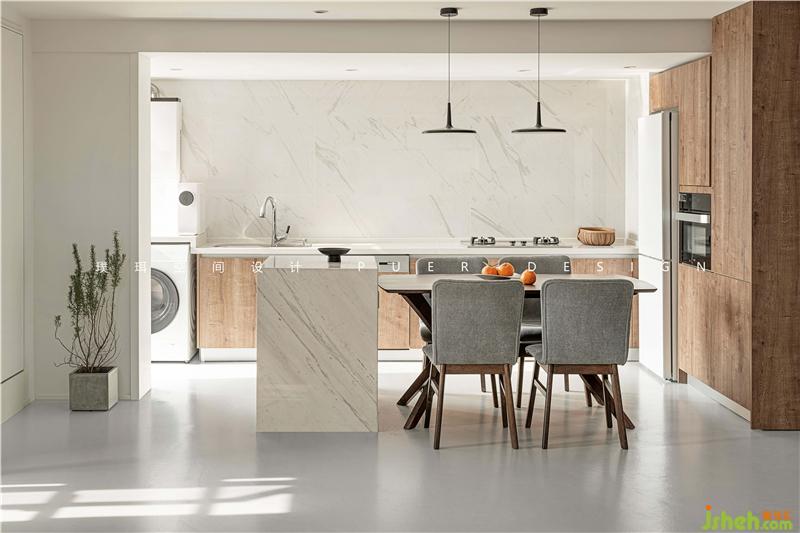 開放式廚房與客廳相串聯(lián),讓女屋主在煮飯時可照看到小朋友。