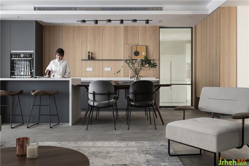 烘焙區(qū)與餐桌相連,烘焙的同時滿足友人小聚,靜謐的灰色與原木色搭配,體現(xiàn)高級感的同時融入溫暖居家氣息。