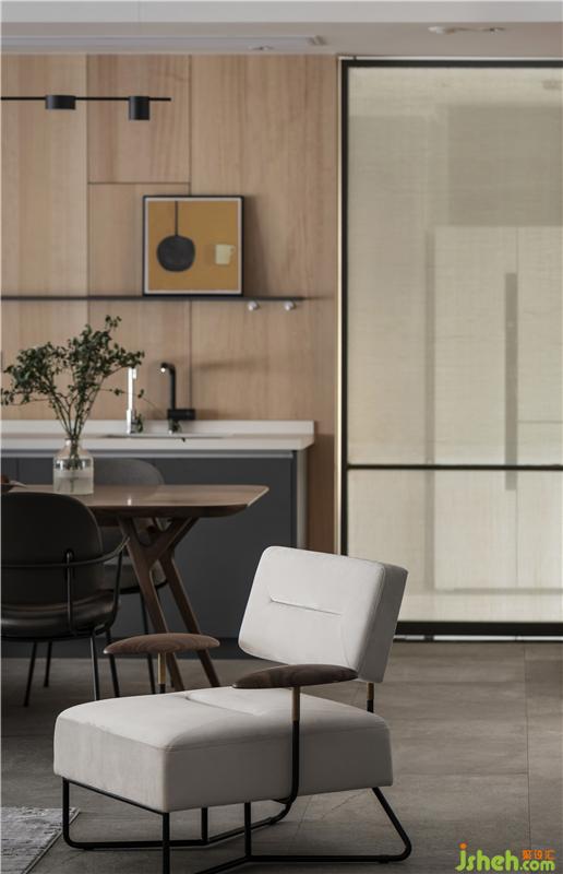 通往中廚的一道夾絲玻璃門,門片到頂?shù)某叽?,通透且靈動。