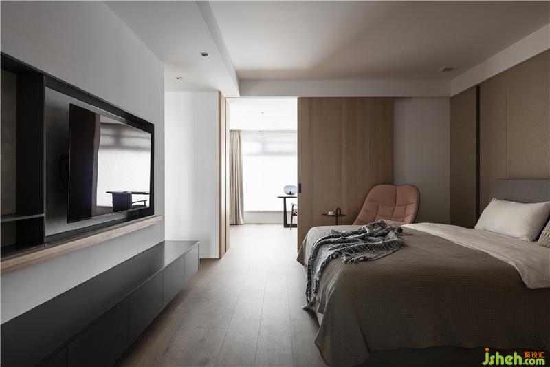臥室電視墻與客廳設(shè)計手法呼應(yīng)。