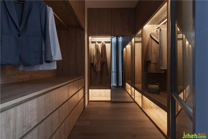 柜子的家裝效果設(shè)計(jì)分割為兩部分,上端封柜門(mén)作為被子及大物件收納,下端做開(kāi)架,方面掛衣服并加入移動(dòng)穿衣鏡功能。
