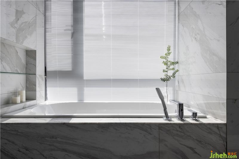 墻面爵士白石材律動(dòng)比例分割,給衛(wèi)浴空間增添活力。家裝效果設(shè)計(jì)采用白色百葉窗簾,營(yíng)造良好的光線氛圍。