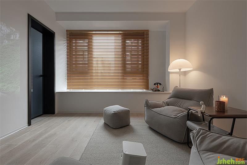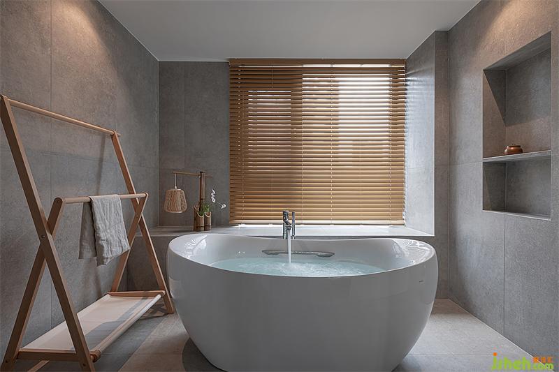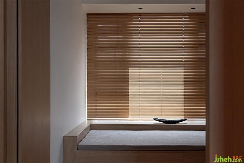 兩個(gè)衛(wèi)生間都扮演著中立的角色,主衛(wèi)以巖板鋪貼墻面,穿插原木質(zhì)感的架子與百葉窗,品質(zhì)與品味有了雙重的保障;飄窗臺(tái)上的木質(zhì)燈具為衛(wèi)浴空間增添了一絲活力。