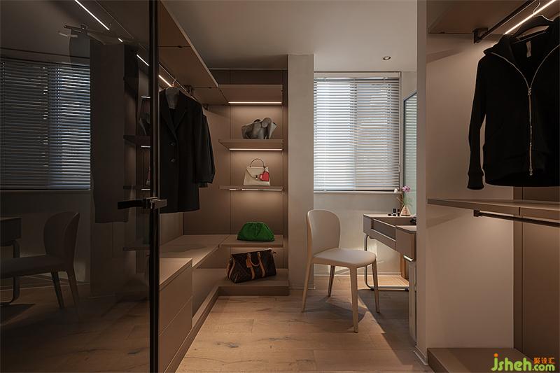 主臥一側(cè),我們將相鄰的一個(gè)小房間并做衣帽間。衣帽間以開架為主,方便掛衣服、放包;梳妝臺(tái)與臥室以玻璃窗相隔,兩人在梳妝的時(shí)候也能有很好的互動(dòng)性。