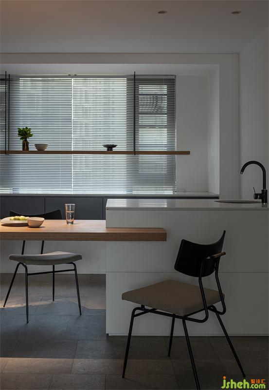 輕食區(qū)是定制的組合式島臺(tái),成都黑白灰設(shè)計(jì)采用白色與原木色搭配,在開放又包容的空間,讓居住者之間擁有更好的互動(dòng)體驗(yàn)。