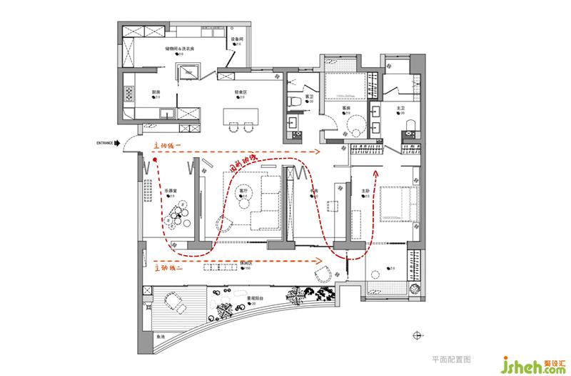 跳脫傳統(tǒng)布局,打破空間隔閡,將樂器室→客廳→書房→主臥劃分為每個相對獨立的半包裹空間,璞珥空間設(shè)計通過兩條過道串聯(lián)不同區(qū)域,一條是從玄關(guān)到主臥的室內(nèi)主動線,另一條則是休閑區(qū)的主動線,形成靈活多變的“回”形動線。