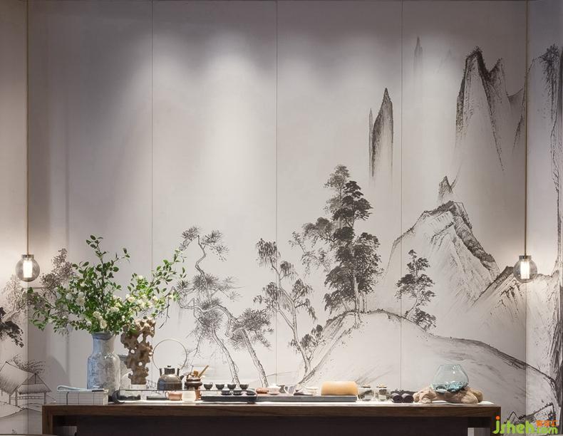 “欲把纖塵留歲月”、“入卷香魂化墨仙”,《溪山行旅圖》與刻Logo的硯臺形成影不離燈的關(guān)系。空間的感受并非單獨(dú)存在,深圳設(shè)計(jì)公司客人從參觀者演變成參與者,仿佛偶遇正在創(chuàng)作的范寬,進(jìn)入范寬作畫的場景。