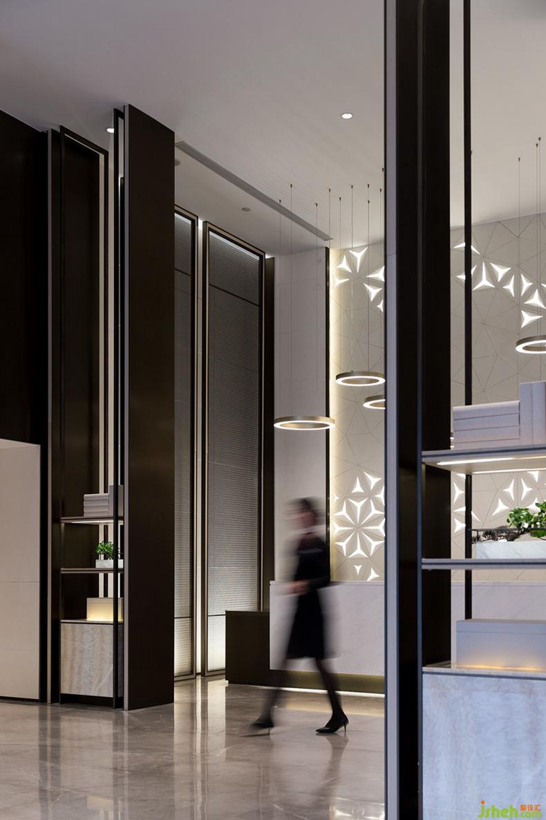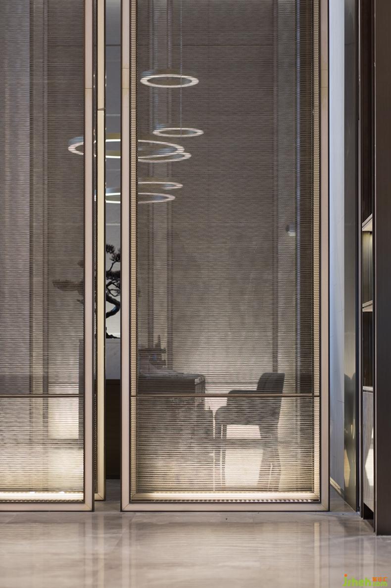 初進(jìn)悅府,抬眼望去,流暢筆直的直線,結(jié)合鋼拉網(wǎng)屏風(fēng)的通透打破原有空間的沉悶感,隱晦的勾勒出入口、沙盤區(qū)、洽談區(qū)的框架結(jié)構(gòu)。接待區(qū)的空間虛實(shí)的有層次,墻面上如蒲公英的鏤空設(shè)計(jì),設(shè)計(jì)公司從隱到顯、有張有馳,覆蓋于墻面之上泛出的細(xì)膩柔和光澤,把空間引人沉浸在一片閑情余緒之中,達(dá)到韻律、情感的統(tǒng)一。