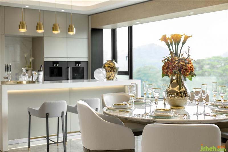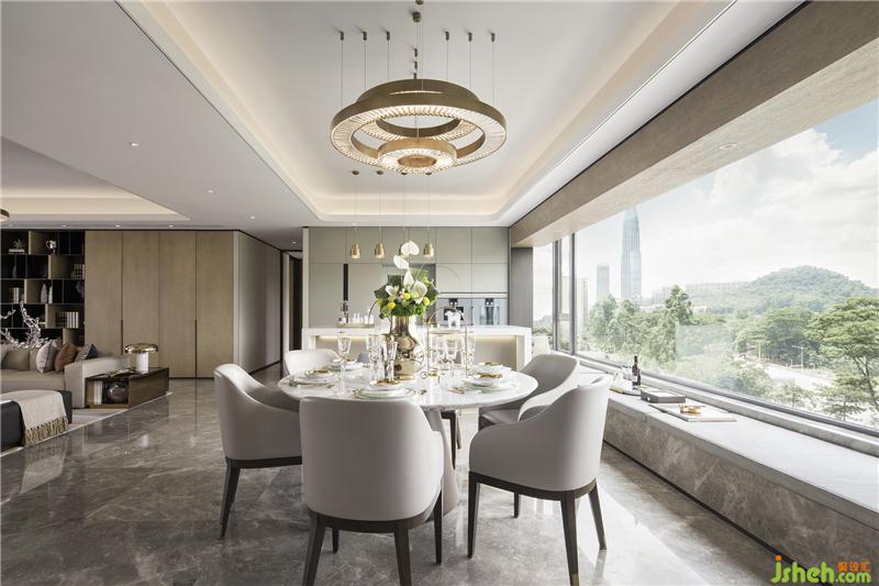 客餐廳設(shè)計(jì)擁有舒適的功能性,超大面寬的玻璃未使用一道分隔,將光線與戶外峰景納入眼簾,大方疏闊的格局,明亮的視野,感受與自然為鄰的愜意。別墅裝修設(shè)計(jì)