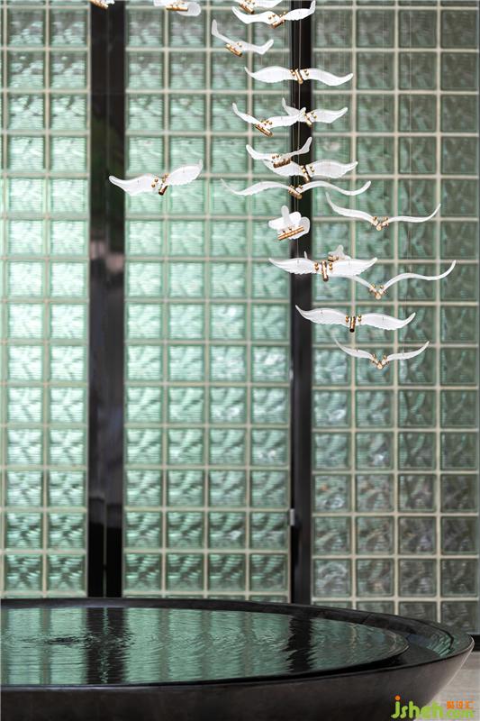 采光天窗的介入是神來(lái)之筆,陽(yáng)光從建筑頂面的天窗傾瀉而下,為大堂空間的演繹拉開(kāi)帷幕,天窗上的燈光藝術(shù)裝置垂墜而下,光影變幻熠熠生輝,形成步入各個(gè)空間的紐帶和亮點(diǎn)。室內(nèi)設(shè)計(jì)師