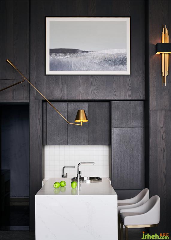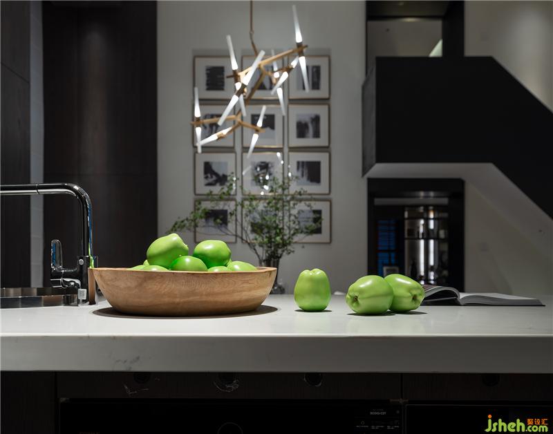 餐廳中,藝術(shù)的共鳴與回響在生活方式的映襯下得以彰顯,木藝餐桌搭配精致的器皿與花枝形燈飾,滿墻的攝影掛畫(huà)定格記憶力與想象力,陽(yáng)光的光暈罩在生機(jī)勃勃的花藝上,平衡黑白灰調(diào)的明度關(guān)系和冷暖關(guān)系,純粹而美好。