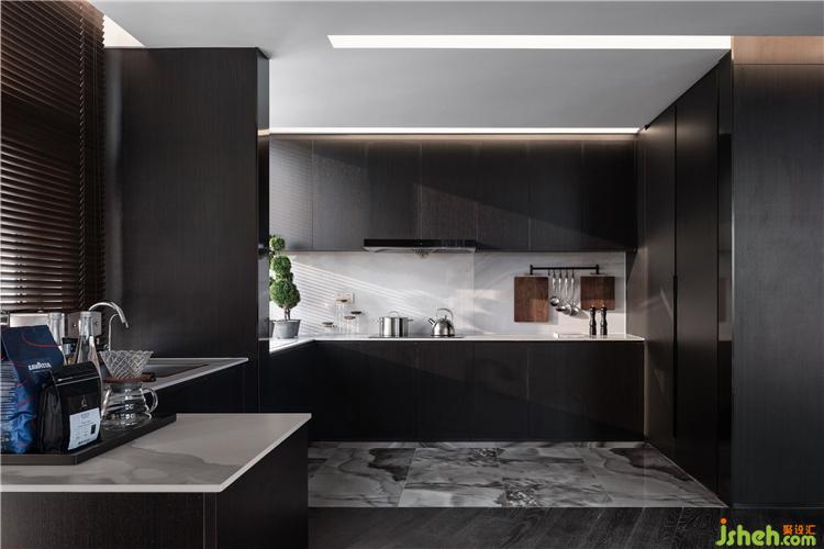 空間界面深灰色木地板、黑色木飾面,與白色的沙發(fā)形成對(duì)比,樣板房設(shè)計(jì)游弋于黑白之間的金屬色與深木色,是對(duì)黑白藝術(shù)的平衡。