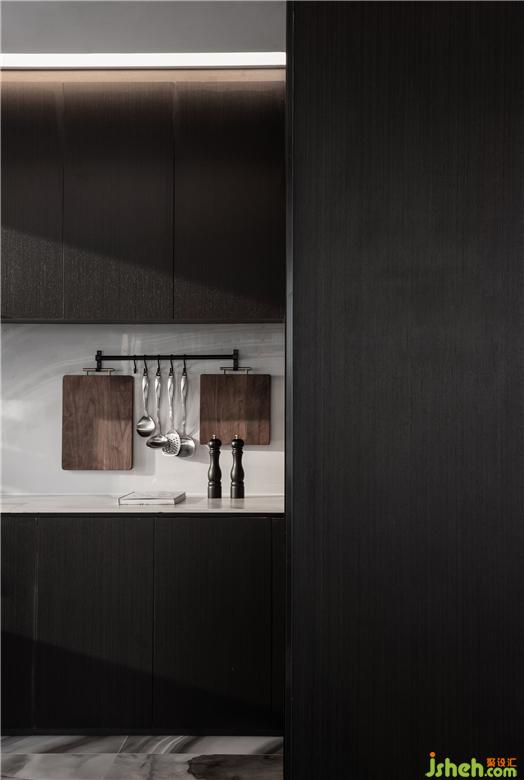 臥室同樣講究配色、材質(zhì)和尺度的把控,纖塵不染的白色天花、濃稠墨黑色調(diào)的衣柜、雅雋灰白調(diào)床品,格調(diào)在黑白灰的濃淡有致間得以統(tǒng)一。