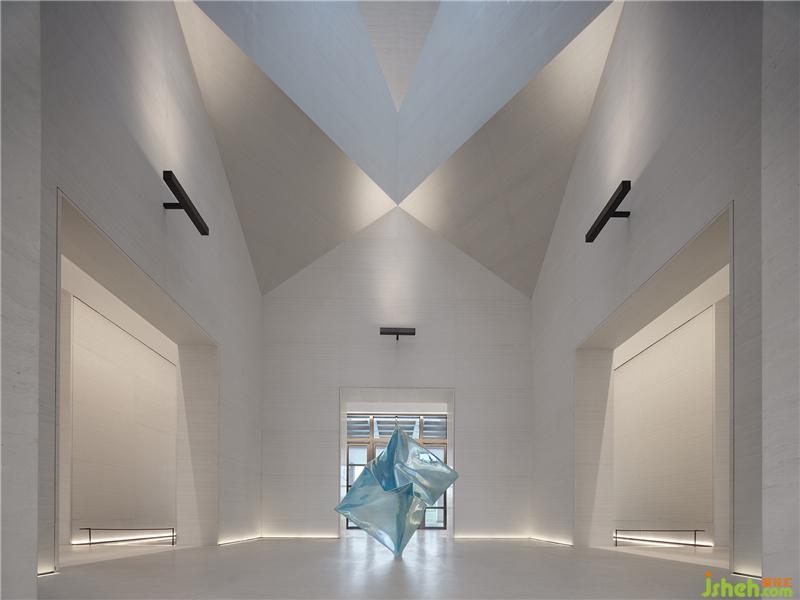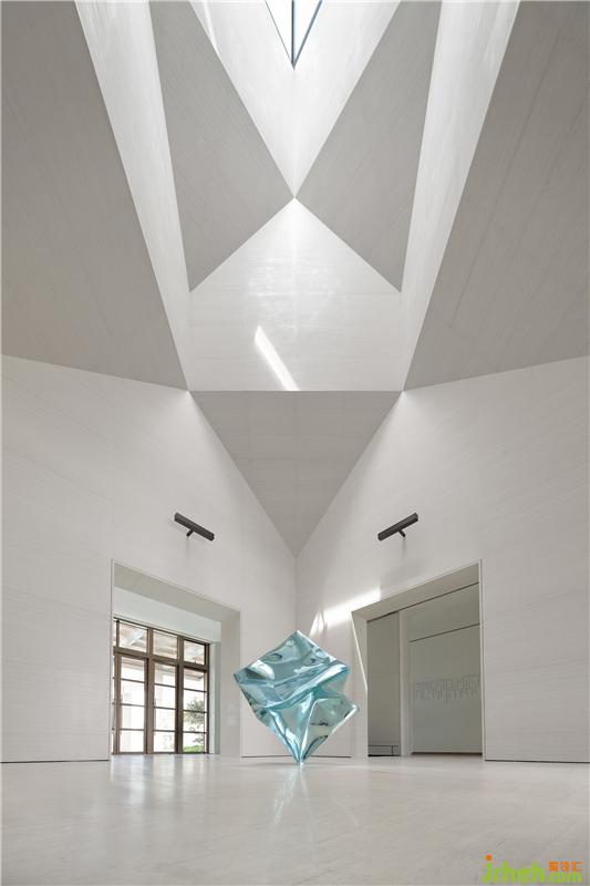 而位于空間正中、凝聚藝術(shù)氣息的藍(lán)色雕塑《檐合》,出自藝術(shù)家張齊努之手,與古建筑屋檐元素形成語言共鳴,一舊一新的文化碰撞,創(chuàng)造豐富的空間審美體驗。