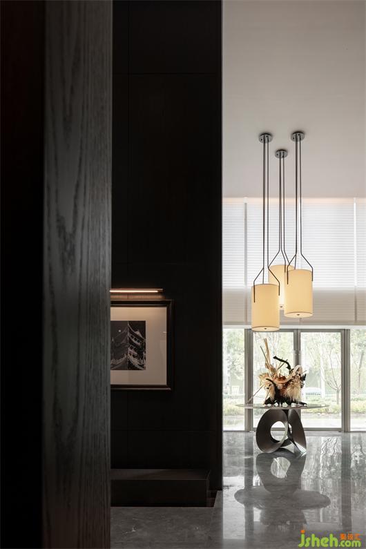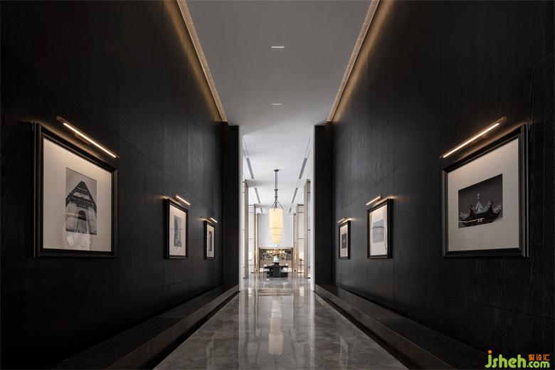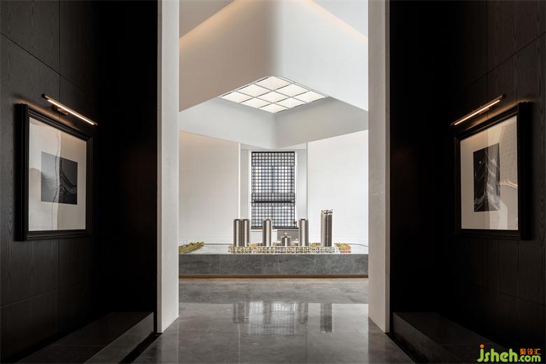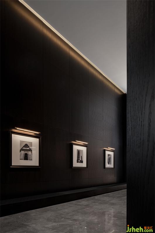 越過沙盤深入中庭,需經(jīng)過一段悠長的走廊。設(shè)計(jì)師有意在此降低明度,以深色的界面包裹空間,深邃、肅穆……心理感受產(chǎn)生變化。裝點(diǎn)于墻上的黑白古建筑攝影作,增強(qiáng)了室內(nèi)的藝術(shù)內(nèi)涵與氣息。人們在行進(jìn)的過程中可一覽太原古城的魅力與豐贍。