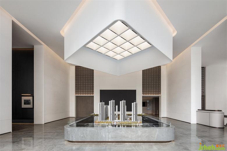 沙盤區(qū)中心明確,視覺不需要出現(xiàn)過多干擾之物,營銷中心設(shè)計(jì)師用統(tǒng)一的單色石材確定了干凈、簡潔的立面控制。天花造型吸取了古代建筑中“藻井”的特點(diǎn),設(shè)計(jì)師采用現(xiàn)代化的藝術(shù)處理方式呈現(xiàn),以具有分量感的體塊結(jié)合略帶溫暖的燈光,將空間梳理地輕重有別,自然而純粹。