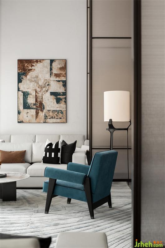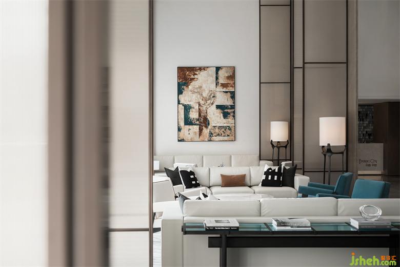 具有體量感的大型吊燈與冷兵器質(zhì)感的三足鼎立的落地?zé)簦瑸榭臻g增色,加強(qiáng)了空間的序列感和尊貴氣息。