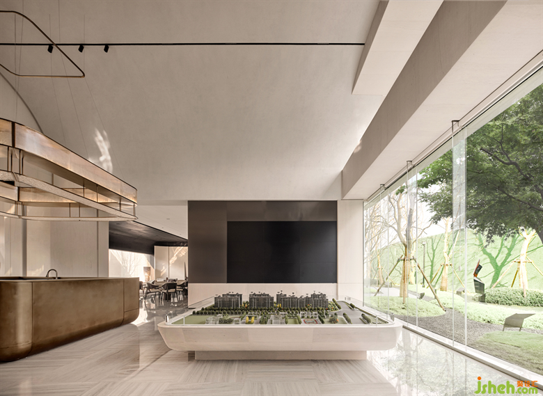 接待廳由兩側(cè)洞口引流,來(lái)到主空間,視野頓時(shí)變得通透開(kāi)闊。水吧區(qū)和沙盤(pán)區(qū)整合在一條軸線中,兩端為園林景觀,有良好的框景效果。