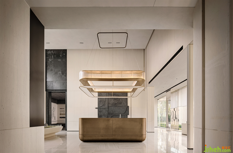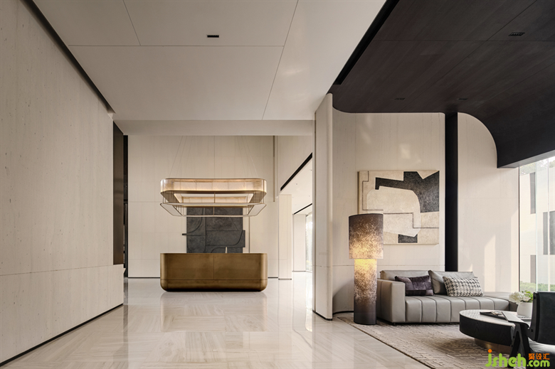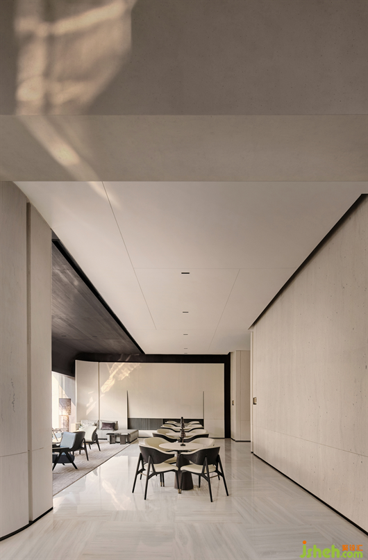 室內(nèi)整體采用了和外立面一樣的淺色溫潤石材,大量的留白界面,少量黑和灰的調(diào)和表達(dá)我們對煙雨江南的色彩印象。