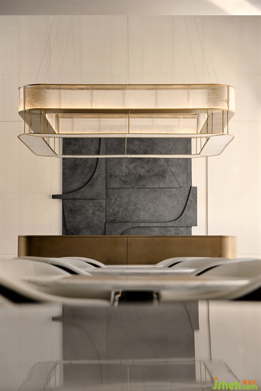 水吧上方的藝術(shù)燈飾,以纖細(xì)的鋼繩懸于空中,梧桐樹葉的紋理刻入周邊,傳統(tǒng)材料與新材料有機(jī)結(jié)合;古銅金、淺色水泥石、深色肌理石,形成粗曠古樸的肌理與平整圓滑的質(zhì)