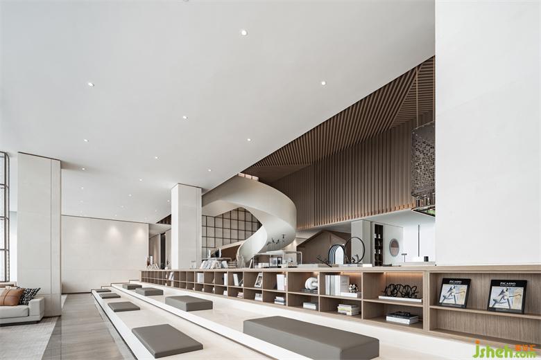 設計師利用層高的落差順勢設計成階梯書吧,豐富了空間體驗層次,書柜上擺放著書籍和文化藝術品,讓場景展開更多交互,營造放松的場所氛圍。