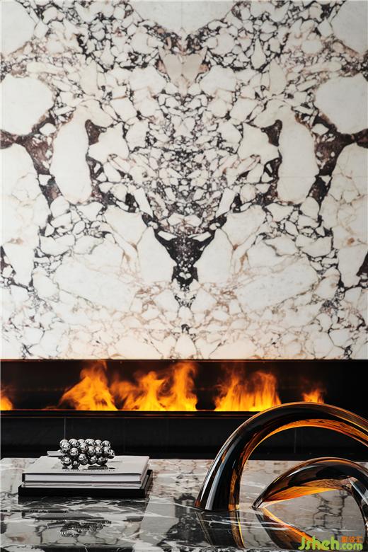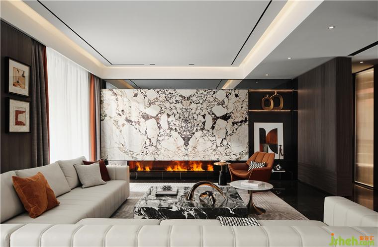 橙色是貫穿每一處的點(diǎn)綴色,它能夠制造溫暖和富足的力量,還能誘發(fā)人的食欲。在白和灰的基底下,整體色調(diào)變成穩(wěn)重又明快的暖色,中間壁爐的火光更是增添了空間的層次和溫暖,默默地構(gòu)建了舒適、親密、溫馨的家庭氛圍。