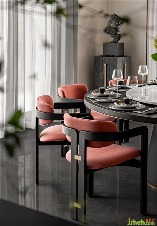 別墅設(shè)計大規(guī)格圓餐桌與吧臺滿足東方家庭的團圓與現(xiàn)代簡餐的自由,餐廳與庭院形成聯(lián)動,營造花園般宴會廳情境。
