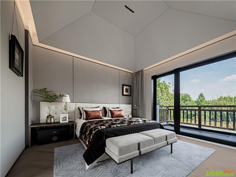 動靜清晰分區(qū)是別墅產品的一大優(yōu)勢,位于二層的臥室擁有絕對的安靜和私密感。別墅設計主臥床體硬裝一體化造型,時尚簡潔。儒雅淡然的色彩,細膩柔和的材質匹配休憩環(huán)境所需的溫和氛圍。