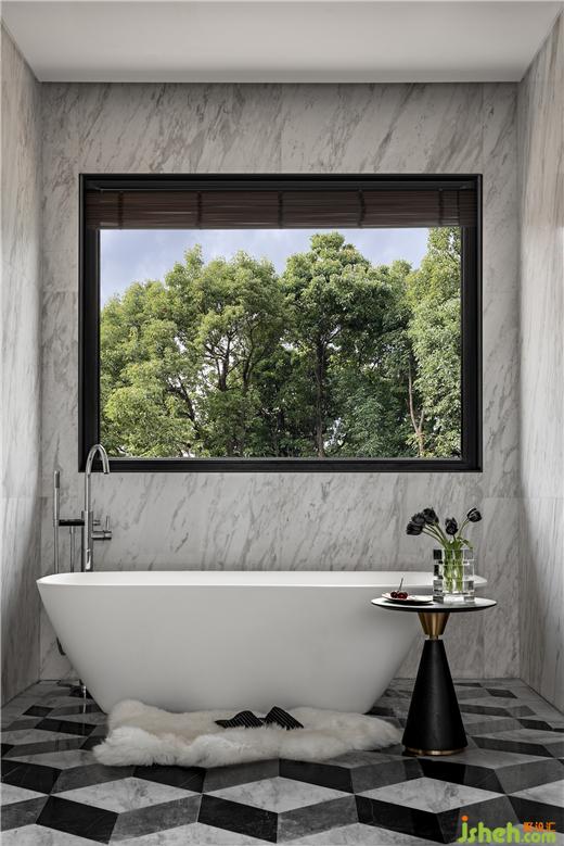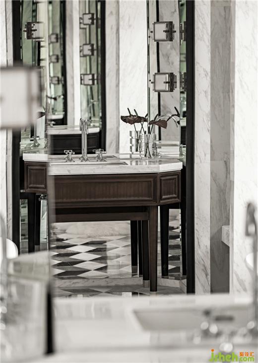 主衛(wèi)在兩端對稱式擺放了兩個一樣的盥洗臺,別墅設計以鏡面反射鏡面,增加互動和趣味,讓空間生動起來。