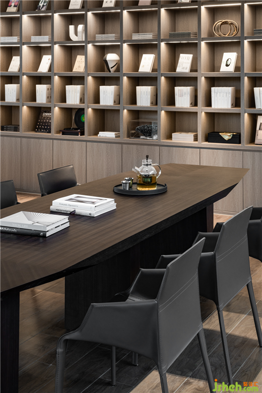 二層以挑空架構形成層高優(yōu)勢,巨幅的落地窗把室外的光與景納入室內,景色宜人。營銷中心設計大幅的展示架組成立面貫穿整個空間,開放性的大空間規(guī)??涉敲郎鐓^(qū)圖書館。