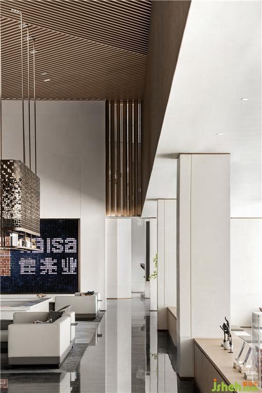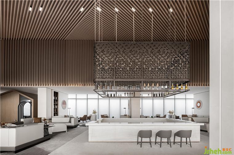 中間的水吧采用了有做舊質(zhì)感的金屬,鏤空的雕刻造型富有工業(yè)美感。營銷中心設(shè)計(jì)與天花的造型相融,能直觀感受到日新月異的材料和工藝的變化。