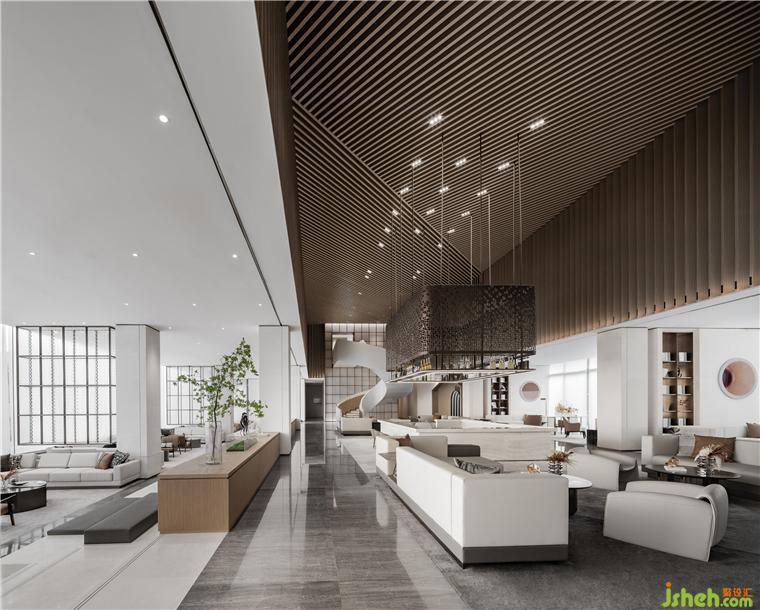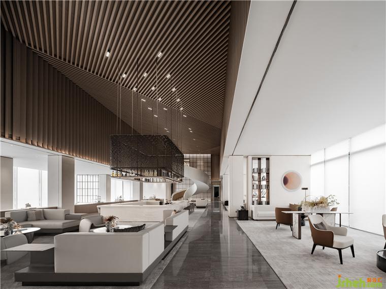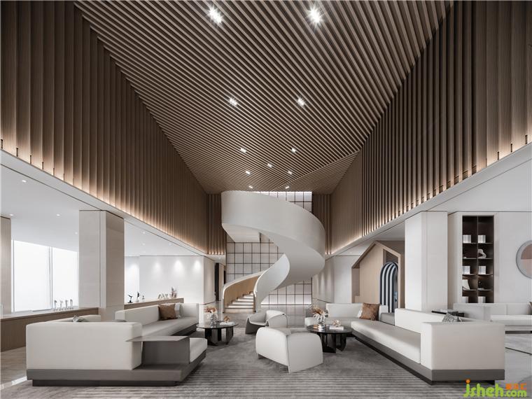公共洽談區(qū)頂部造型設(shè)計(jì)靈感源于沈陽中國工業(yè)博物館的外立面,博物館建筑以鋼鐵等金屬材料塑造硬朗大氣的外觀,我們將建筑造型的特色提煉為室內(nèi)設(shè)計(jì)的語匯,營銷中心設(shè)計(jì)使用溫潤的木材朝不同角度有序列的順延,生成有強(qiáng)烈造型感的空間結(jié)構(gòu)。在視覺上更為簡約大方,且增強(qiáng)了與人的親近感。
